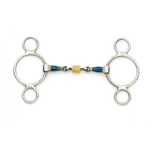 Centaur 2-Ring Gag with Center Loose Copper Roller Disks is a double jointed snaffle with center lozenge in the French link style. The link has loose copper rolling disks for horse to play with and to prevent pulling and grabbing onto the bit. Each side of the bit is perfectly balanced to assure total comfort, connection, and response. Lost wax cast and hand polished from the highest grade of 18/8 Stainless Steel. Available in sizes 5 and 5.25.