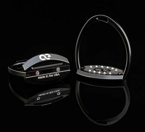 The Elite Stirrups from American Equus are made in the USA from 6061 T6 Aluminum, a grade of corrosion-resistant aluminum that is heat tempered, or hardened, so it has a higher strength-to-weight ratio. The Illusion Black powder coat has a clear coat finish for lustrous shine. Elite English stirrup irons are fitted with the Pointed Apex traction pins for excellent foot security. Riders who have experienced foot numbness or joint pain with their old stirrup irons report much greater comfort while riding and competing with the Elite Stirrup. The handsome American Equus Elite Stirrup offers safety, comfort, performance, and plenty of sophisticated style.