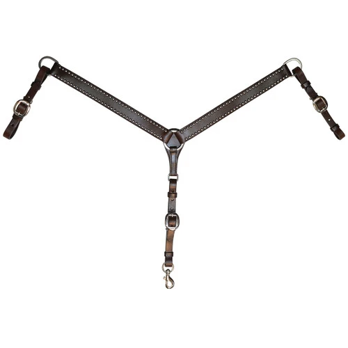 Breast Collar is stitched and has silver colored buckles on the tugs and a swivel snap on the tie down. High quality leather is accented with metal dots making it a nice Western breast collar to complement other embellished tack without being a perfectly matched set. If a matched set is what you’re after, check out the Circle Y Spots Straight Browband Headstall in Walnut at Mary’s! Nicely coordinated tack is always in style!