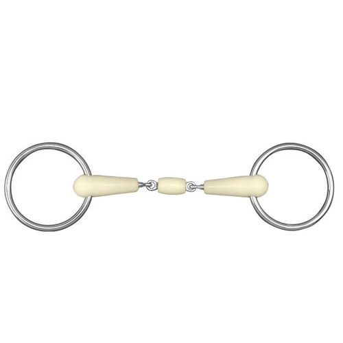 The Happy Mouth Thin Double Jointed Roller Loose Ring has a comfortable mouthpiece made with an apple-scented, space-aged polymer that encourages a horse to more readily accept a bit. The pleasant smell and feel add up to a gentler English riding bit for a happier horse. The double jointed snaffle with center roller has a stainless steel mouth covered in polymer and stainless steel loose ring cheeks.
