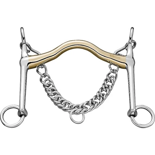The Bemelmans Weymaouth 5cm bit has a quicker effect while the 7cm version has a softer curb action that is slightly delayed once the rein is engaged. The longer cheek will increase overall pressure on the poll and neck. Sensogan metal is an alloy of copper, manganese, and zinc that oxidizes for a pleasing flavor. It has less copper in the alloy than Aurigan. The Bemelmans Weymouth 5cm and 7cm bits were developed with Sprenger rider Jean Bemelmans, who wanted a bit to reflect the needs of horse and rider while respecting the sensitivity of the horse’s mouth. Sprenger Bemelmans Weymouth comes with a curb chain which should be adjusted so it can accept an angle of approximately 45 degrees. This Herm Sprenger Bemelmans Weymouth Bit is eligible for . Click now for details!