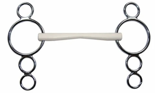 The Herm Sprenger Duo Vienna Show Jumping bit features a straight edge flexible bar mouthpiece that leaves room for the horse’s tongue and encourages chewing for better bit acceptance. Reinforced with a steel cable. The flexible, plastic mouth is 16mm wide with three Stainless Steel ring cheeks. The Duo Vienna Show Jumping bit is available in sizes: 5, 5 1/4, and 5 3/4. Sprenger part #41 303.