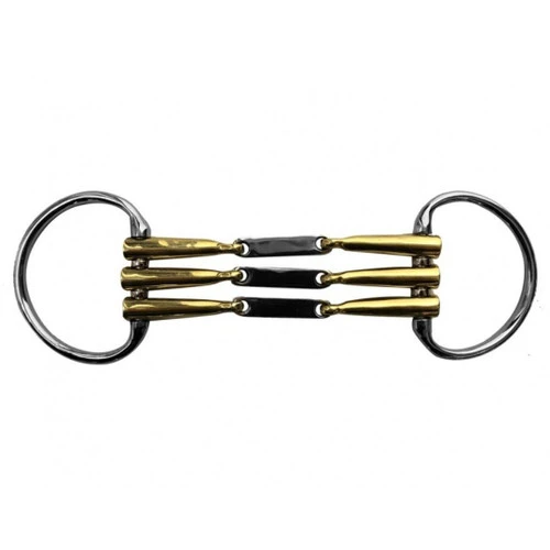 The unique Jump’in Triple Cannon French Link Eggbutt bit is designed for horses that retract their tongue during work. The three cannons, or mouthpieces, provide a larger contact area to help quiet the tongue. The long French link pieces enhance the action.