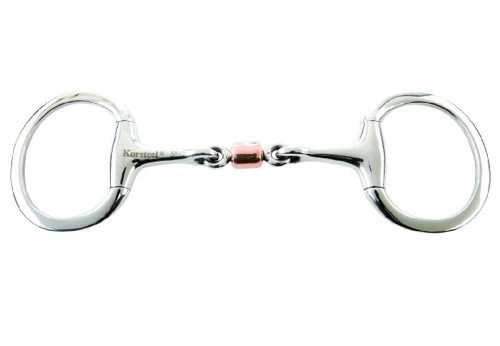 Korsteel Copper Roller Eggbutt Bit has fixed eggbutt rings for consistent contact and a smooth copper barrel roller that encourages the horse to salivate and relax. The roller can help pacify a busy-mouthed horse while preventing him from pressing and locking against the bit.