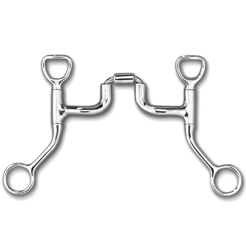 Myler HBT Shank with Sweet Iron Correctional Ported Barrel has the MB 47PB mouthpiece. This Level 2-3 Myler western bit has 5″ HBT shanks with two rings. The entire HBT shank moves independently of the mouthpiece. The stainless steel correctional bit has a polished sweet iron ported barrel and copper inlay that promotes salivation. Level Two Myler Bits are for horses who have had training and mastered basic skills like bending, lead changes, side passes, and collection or relaxed head position. Level Two Bits use more bar pressure than Level One Bits and may have features that apply curb, palate and/or poll pressures. Level Three Myler Bits are for horses considered broke who willingly obey commands, relax at the poll and respond well to seat, hand and leg cues. Level Three Bits feature the curved mouthpiece but generally apply most pressure to the bars and may incorporate features that apply curb, palate and/or poll pressures as well. Myler Level Three Bits are best used by advanced riders to make the finished horse as soft as possible in the mouth. Myler Sweet Iron Correctional Ported Barrel Bit with HBT Shank comes in a size 5.