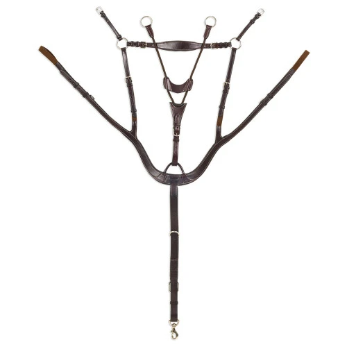 Pessoa PRO 5-Point Breastplate in rich dark brown has silver tone fittings and crisp white stitching. The leather and rolled cord running martingale can be detached if desired. Pessoa’s 5-Point Breastplate gives horses freedom of movement and comfort while giving riders reliable security and a classic look with their English tack. Full size.