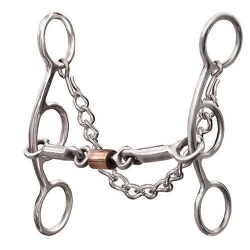 Professional’s Choice Futurity 3-Piece Smooth bit has a copper roller mouthpiece that’s comfortable on the tongue, entertains a busy-mouthed horse, and promotes salivation. Three piece smooth dog-bone bit comes with attached curb chain.