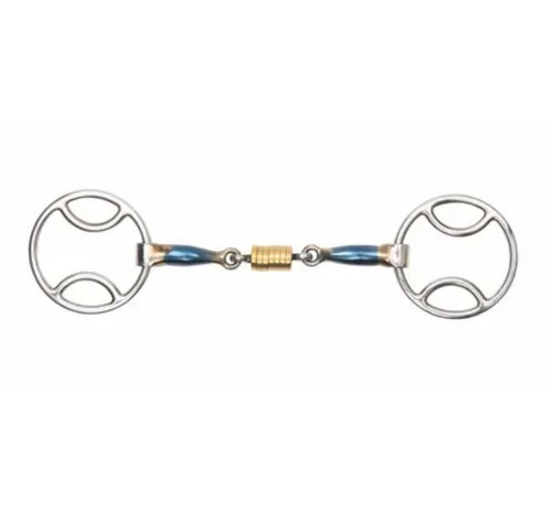 The Blue Sweet Iron Bevel with Roller Link gag bit from Shires Equestrian has seven brass alloy loose rings on a center link. The blue sweet iron mouthpiece oxidizes to create a pleasant taste, encouraging the horse to chew, salivate, and soften.