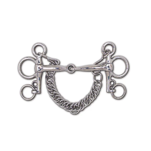 Toklat Jointed Tom Thumb Pelham bit is durable stainless steel with shorter Tom Thumb style Pelham cheeks that measure 3.75 inches. This bit has a simple snaffle mouth for pressure on the tongue, bars, and palate. There is leverage with a curb rein, but the shorter cheek means not as much leverage as a standard Pelham.